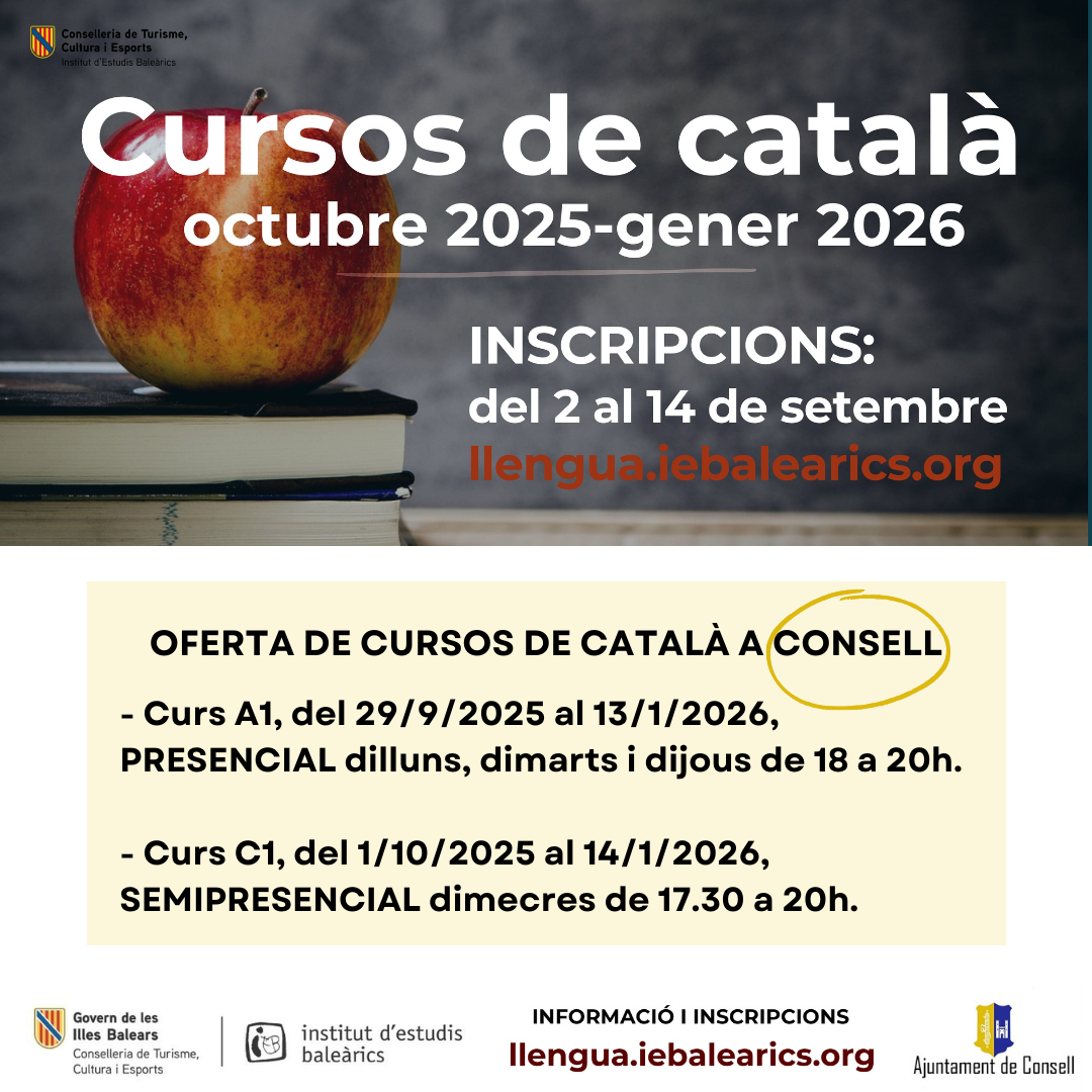 Tornen els cursos de català al nostre municipi gràcies a la col·laboració entre l'Institut d'Estudis Baleàrics i l'Ajuntament de Consell. Pel període octubre 2025-febrer 2026 s'han programat els següents cursos: